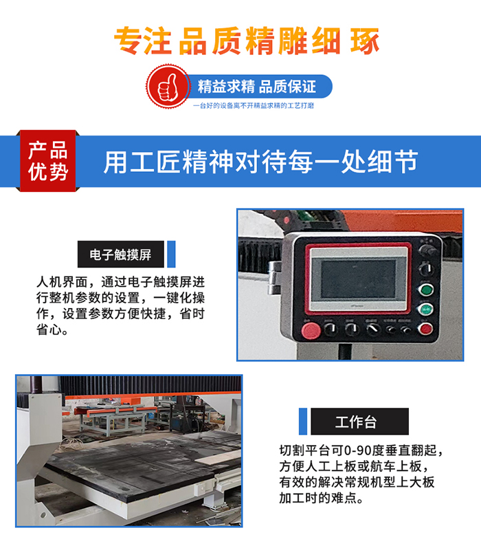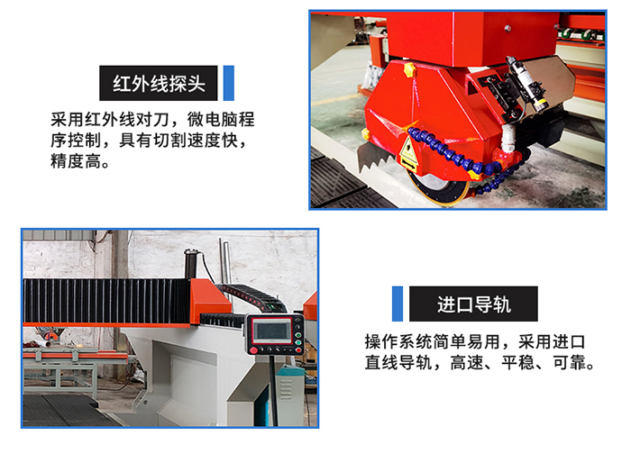 全自动350红外线桥式切割机采用先进精密的CNC数控龙门一体成型工艺,结构稳固耐用,整机的大梁及边梁采用直线导轨,从而使设备切割更精准,灵活性更高,采用伺服PLC控制系统,机头90度两边自动倒角。机头带45度自动倒角,可四边倒角,液压传动,稳定流畅,全自动数控自动操作,加工简单,速度快,精度高。直线、竖线、菱形任意角度切割,总体占地面积小于15㎡,整体装车,现场安装方便,适用于中小型石材深加工常用机械。